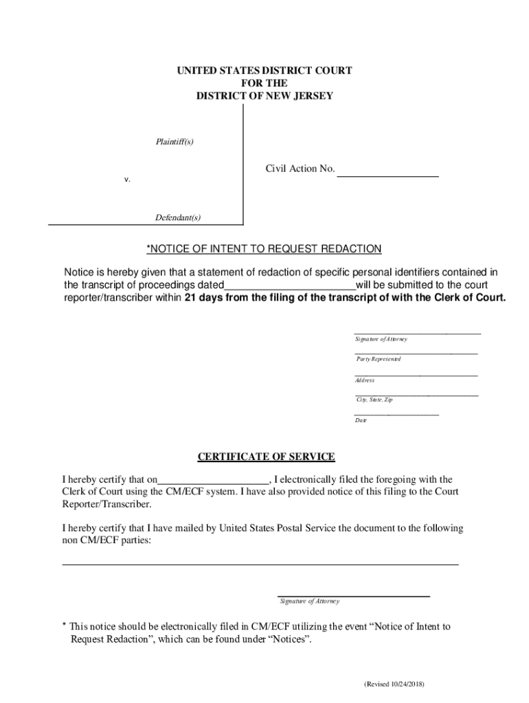 UNITED STATES DISTRICT COURT FOR THE DISTRICT OF NEW JERSEYPlaintiff(s)Civil Action No. v. Defendant(s)*NOTICE OF INTENT TO REQUEST REDACTION Notice is hereby given that a statement of redaction of