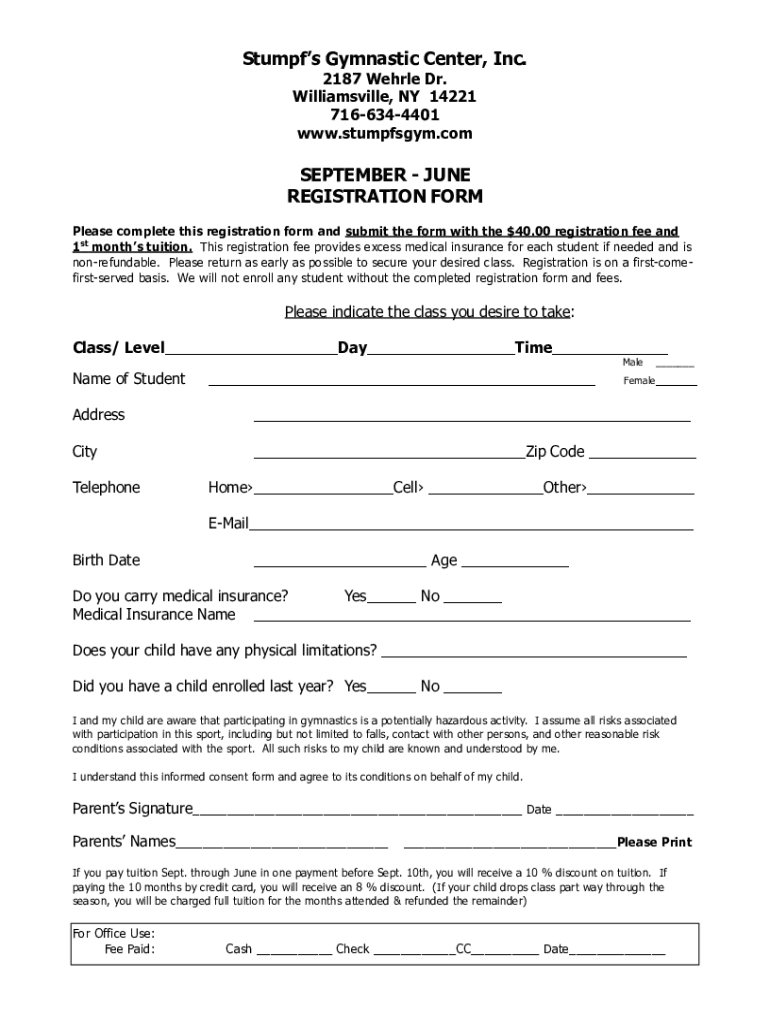 Stumps Gymnastic Center, Inc. 2187 Were Dr. Williamsville, NY 14221 7166344401 www.stumpfsgym.comSEPTEMBER JUNE REGISTRATION FORM Please complete this registration form and submit the form with the