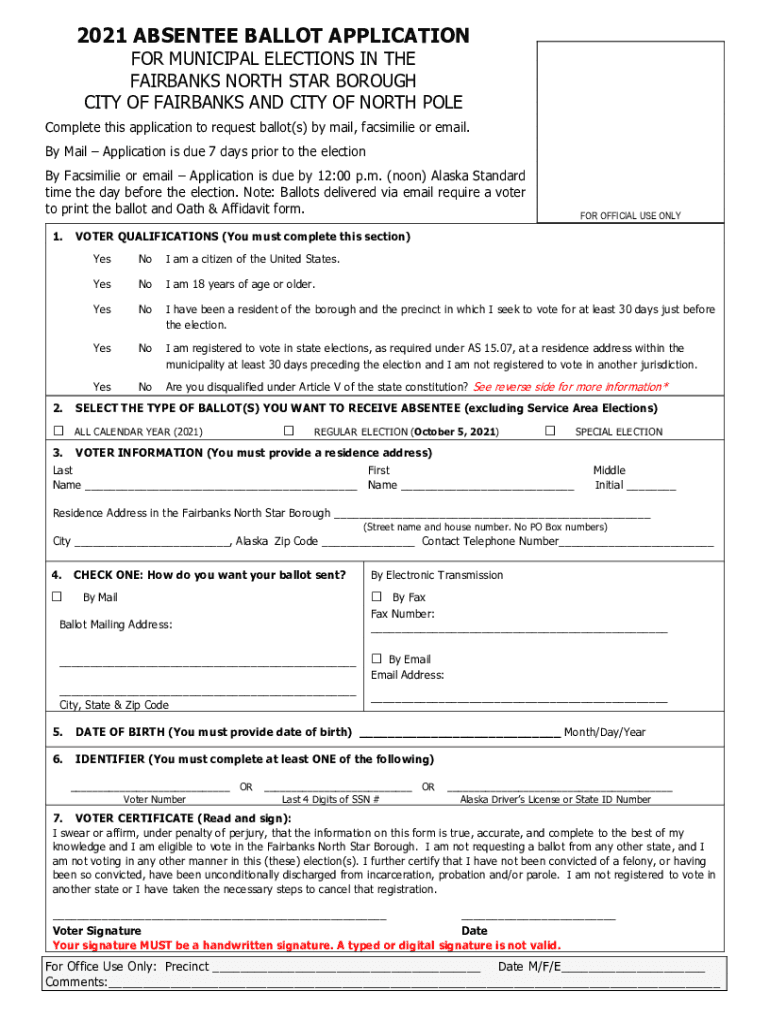 2021 ABSENTEE BALLOT APPLICATION FOR MUNICIPAL ELECTIONS IN THE FAIRBANKS NORTH STAR BOROUGH CITY OF FAIRBANKS AND CITY OF NORTH POLEComplete this application to request ballot(s) by mail, facsimile