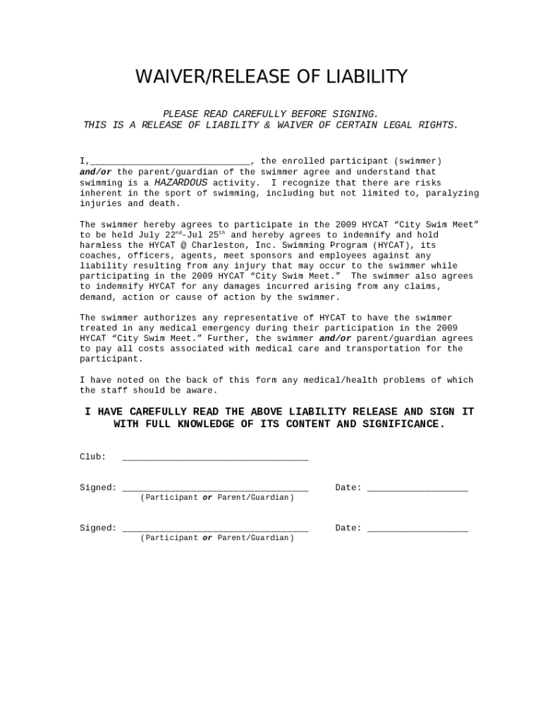 Template I,, the enrolled participant (swimmer) and/or the parent/guardian of the swimmer agree and understand that swimming is a HAZARDOUS activity instructions