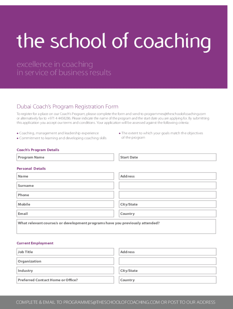 Excellence in coaching in service of business results Dubai Coach Program Registration Form To register for a place on our Coach Program, please complete the form and send to programs theschoolofcoaching.com