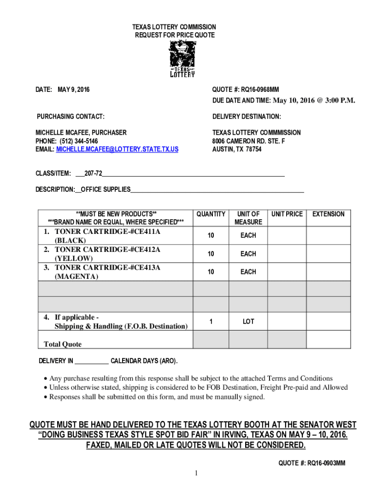 TEXAS LOTTERY COMMISSION REQUEST FOR PRICE QUOTED ATE: MAY 9, 2016QUOTE #: RQ160968MM DUE DATE AND TIME: May 10, 2016 3:00 P.M.PURCHASING CONTACT:DELIVERY DESTINATION:MICHELLE McAfee, PURCHASER PHONE: