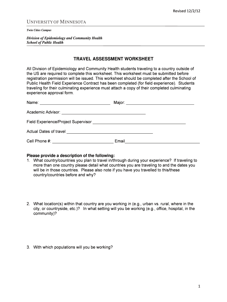 Revised12/2/12 UNIVERSITY OF MINNESOTA Twin Cities Campus Division of Epidemiology and Community Health School of Public Health TRAVEL ASSESSMENT WORKSHEET All Division of Epidemiology and Community