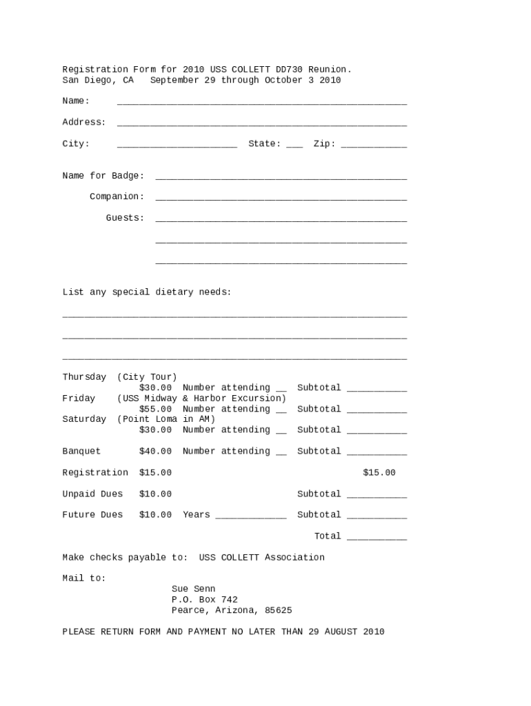 How should you fill out the Registration for 2010 USS COLLETT DD730 Reunion template