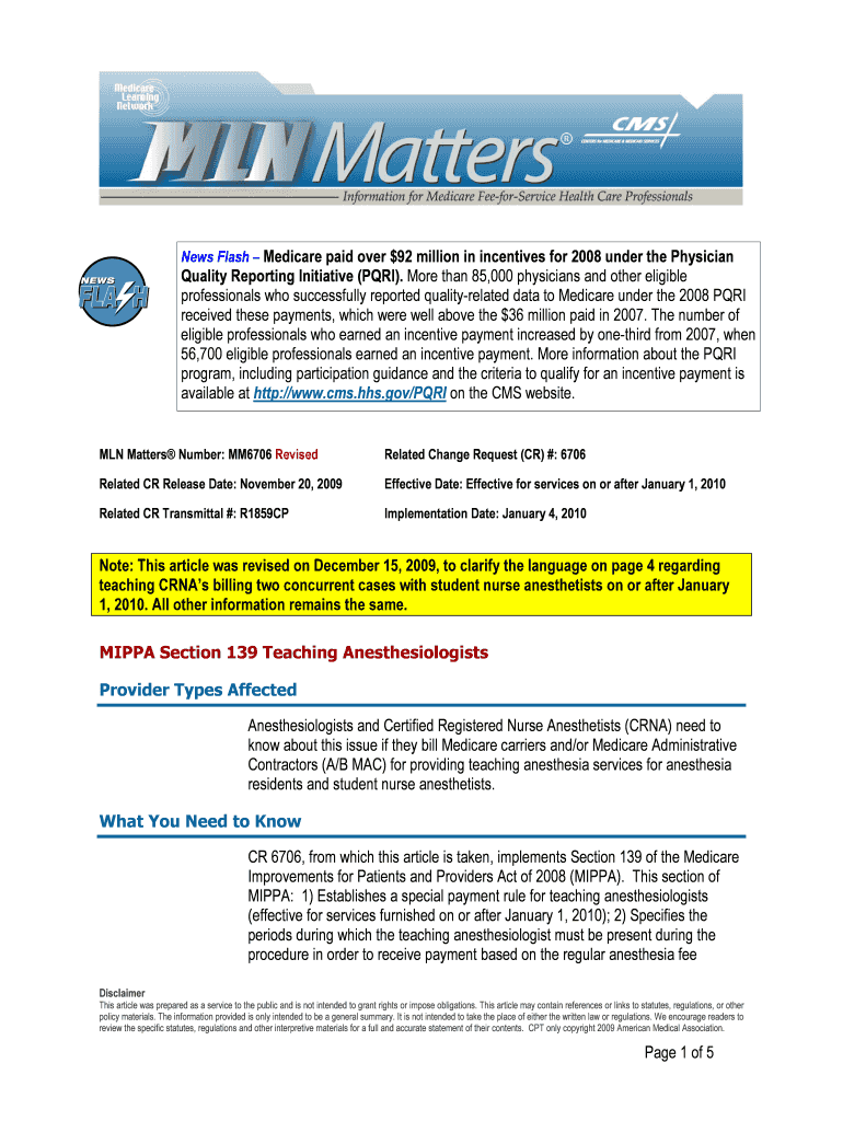 This article discusses the payment policies for teaching anesthesiologists and Certified Registered Nurse Anesthetists (CRNAs) under the Medicare Improvements for Patients and Providers Act (MIPPA)