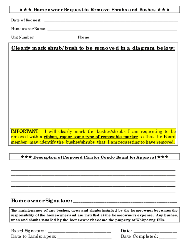 Homeowner Request to Remove Shrubs and Bushes Date of Request: Homeowner Name: Unit Number: Phone: Clearly mark shrub/bush to be removed in a diagram below:IMPORTANT: I will clearly mark the bushes/shrubs