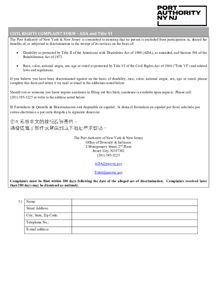 CIVIL RIGHTS COMPLAINT FORM ADA and Title VI The Port Authority of New York & New Jersey is committed to ensuring that no person is excluded from participation in, denied the benefits of, or subjected