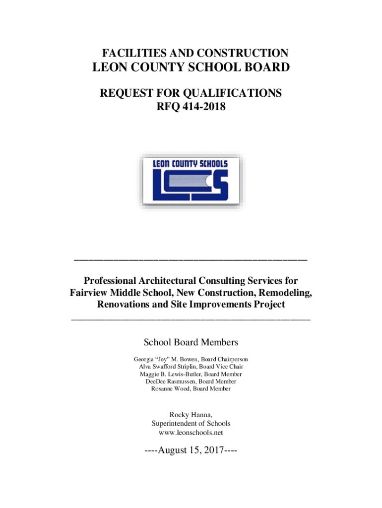 FACILITIES AND CONSTRUCTIONLEON COUNTY SCHOOL BOARD REQUEST FOR QUALIFICATIONS RFQ 4142018 Professional Architectural Consulting Services for Fairview Middle School, New Construction, Remodeling,