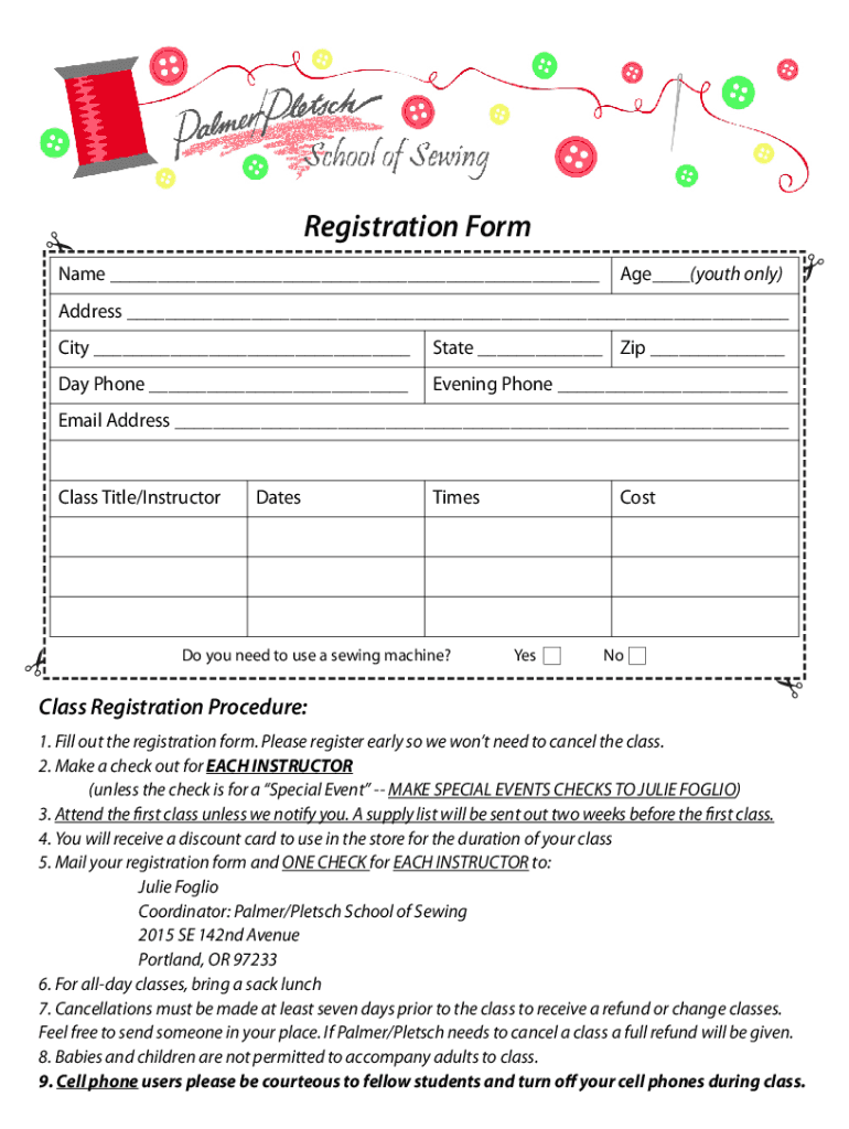 Registration Form Name Age (youth only)Address City State Zip Day Phone Evening Phone Email Address Class Title/InstructorDatesTimesDo you need to use a sewing machine? CostYesNoClass Registration