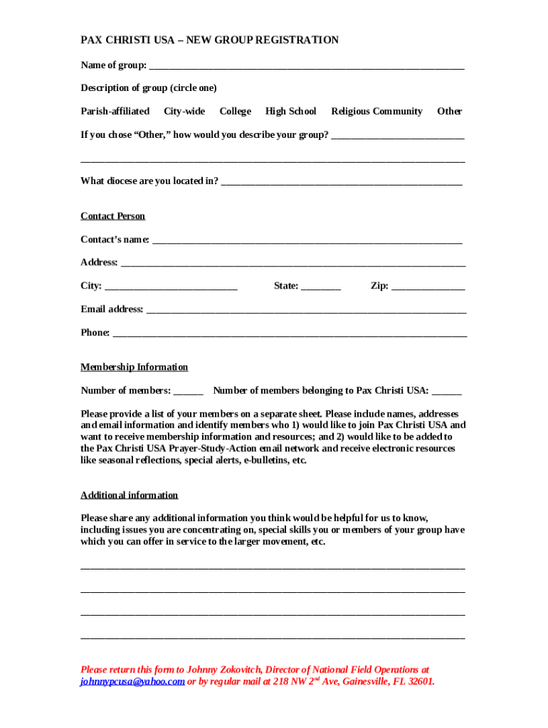 The PAX CHRISTI USANEW GROUP REGISTRATION is a fillable form in MS Word extension which can be completed and signed for specific reasons. Then, it is furnished to the exact addressee in order to provide certain details of certain kinds. The completion and signing can be done or with an appropriate application e. g. PDFfiller. These tools help to fill out any PDF or Word file online. While doing that, you can edit it according to the needs you have and put a valid digital signature. Upon finishing, you send the PAX CHRISTI USANEW GROUP REGISTRATION to the respective recipient or several of them by email and also fax. PDFfiller offers a feature and options that make your Word form printable. It offers different settings when printing out appearance. It does no matter how you will distribute a form after filling it out - in hard copy or electronically - it will always look professional and organized. In order not to create a new document from scratch over and over, turn the original file into a template. Later, you will have an editable sample.