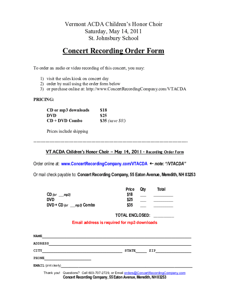 St. Johns bury SchoolConcert Recording Order Form
