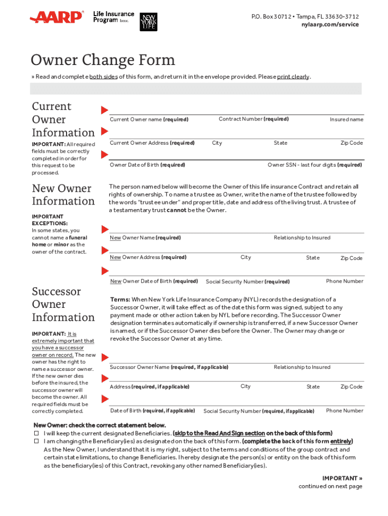 P.O. Box 30712 Tampa, FL 336303712 nylaarp.com/serviceOwner Change Form Read and complete both sides of this form, and return it in the envelope provided. Please print clearly. Current Owner name