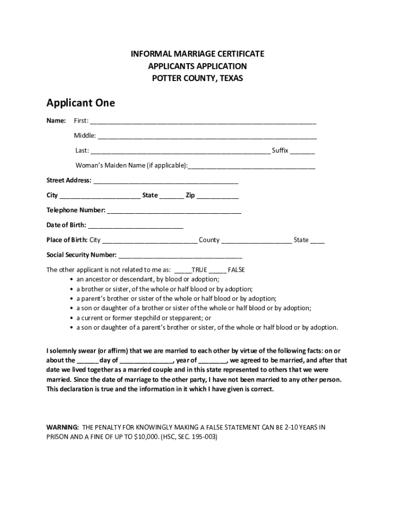 The information on the attached informal marriage certificate application must match exactly to the ID that you will be using as proof of identification whether it be a driver's license, certified