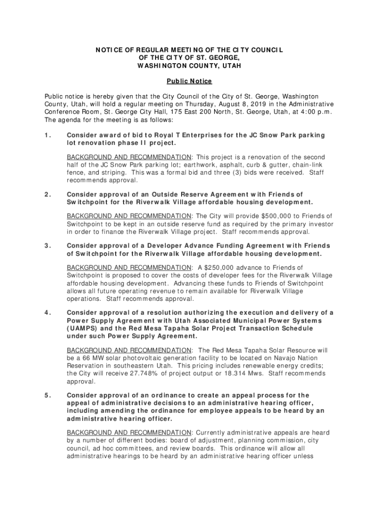 Public Notice is hereby given that the City Council of the City of St. George, Washington