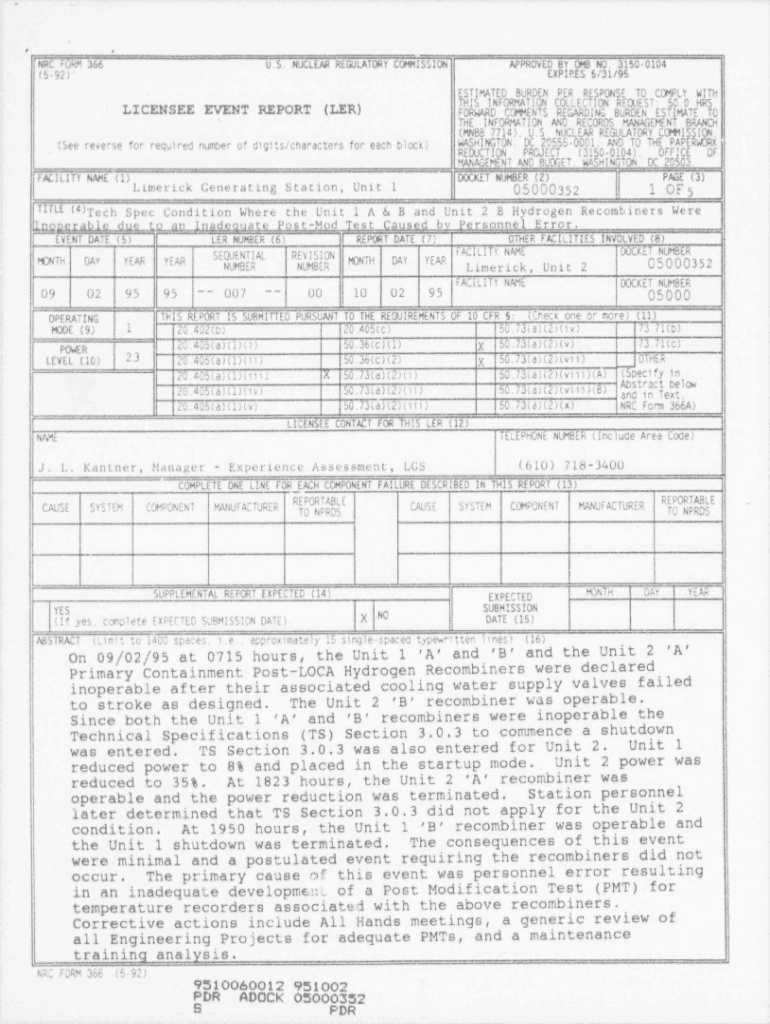 . 'e.NRC f0hM 366APPROVED BY OMB NO. 3150 0104U. S. NUCLEAR REGULATORY COMMISSIONEXPIP.ES 5/31/95(5 92)*LY WITHES MATED BURG PER RESPONSE TO f0RWARD COMMENTS Di BL EN EST TE LICENSEE EVENT REPORT