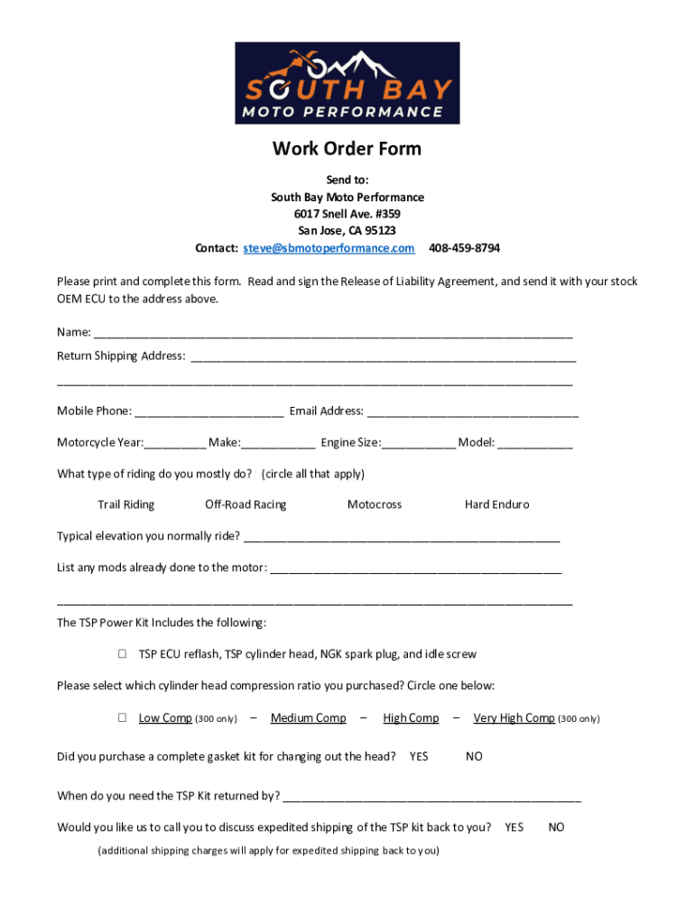 Work Order Form Send to: South Bay Motor Performance 6017 Snell Ave. #359 San Jose, CA 95123 Contact: Steve sbmotoperformance.com 4084598794 Please print and complete this form. Read and sign the