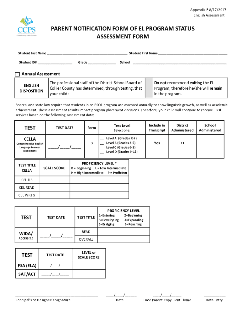 Appendix F 8/17/2017 English AssessmentPARENT NOTIFICATION FORM OF EL PROGRAM STATUS ASSESSMENT FORM Student Last Name Student First Name Student ID# Grade School Annual Assessment ENGLISH Disposition