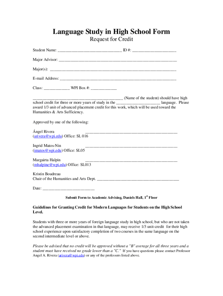Language Study in High School Form Request for Credit Student Name: ID #: Major Advisor: Major(s): Email Address: Class: WEI Box #: (Name of the student) should have high school credit for three or