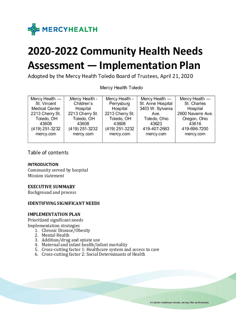 20202022 Community Health Needs Assessment Implementation Plan Adopted by the Mercy Health Toledo Board of Trustees, April 21, 2020, Mercy Health Toledo Mercy Health St. Vincent Medical Center 2213