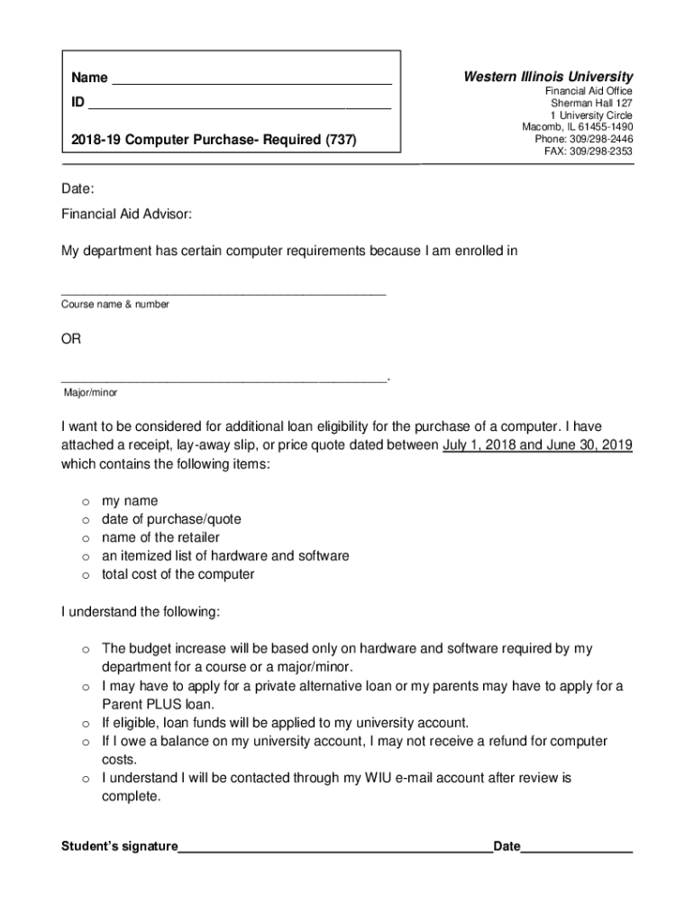 Name Western Illinois University Financial Aid Office Sherman Hall 127 1 University Circle Macomb, IL 614551490 Phone: 309/2982446 FAX: 309/2982353ID 201819 Computer Purchase Required (737)Date: Financial