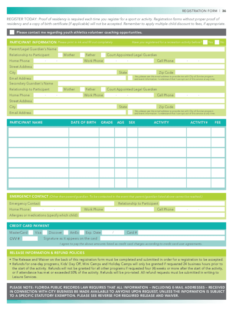REGISTRATION FORM 36REGISTER TODAY: Proof of residency is required each time you register for a sport or activity. Registration forms without proper proof of residency and a copy of birth certificate