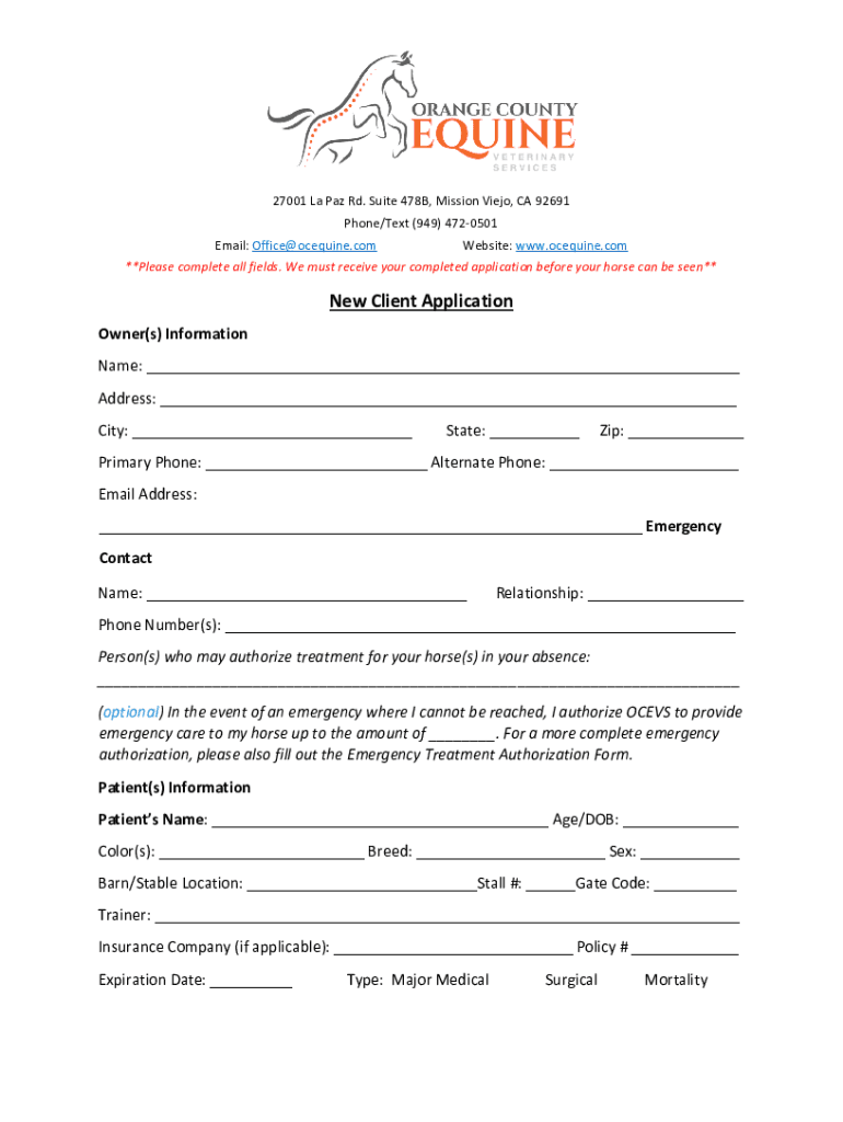 27001 La Paz Rd. Suite 478B, Mission Viejo, CA 92691 Phone/Text (949) 4720501 Email: Office equine.website: www.ocequine.com**Please complete all fields. We must receive your completed application