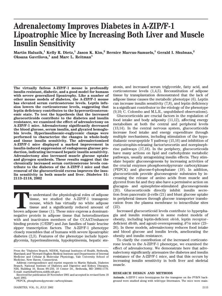 Get the free Adrenalectomy Improves Diabetes in A-ZIP/F-1 Lipoatrophic Mice by ... - diabetes dia...