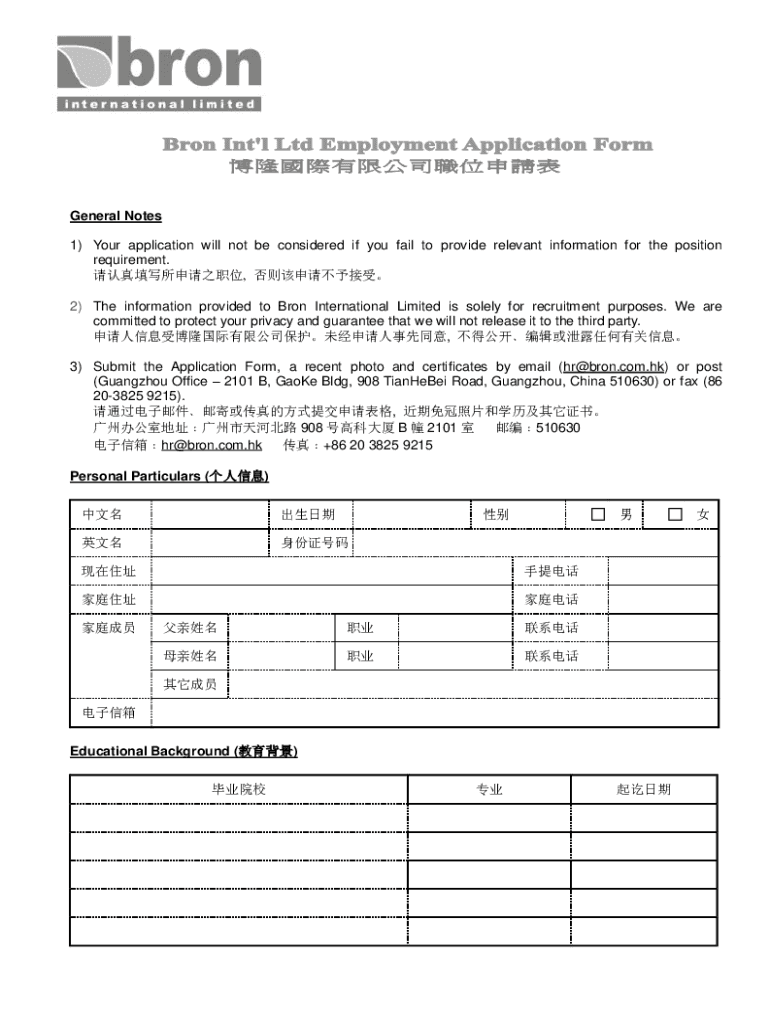 Submit the completed employment application form to the HR department of Bron International Limited either in person or through the designated submission method.
