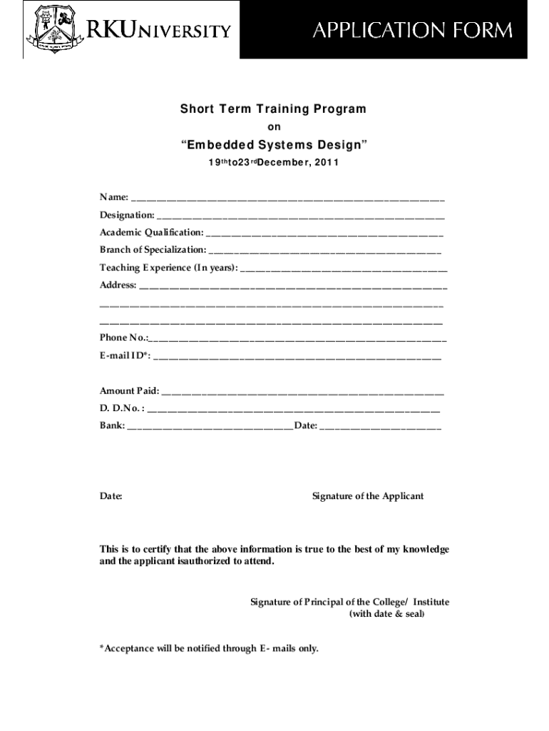 Short Term Training Program embedded Systems Design 19thto23rdDecember, 2011Name: Designation: Academic Qualification: Branch of Specialization: Teaching Experience (In years): Address: Phone No.:
