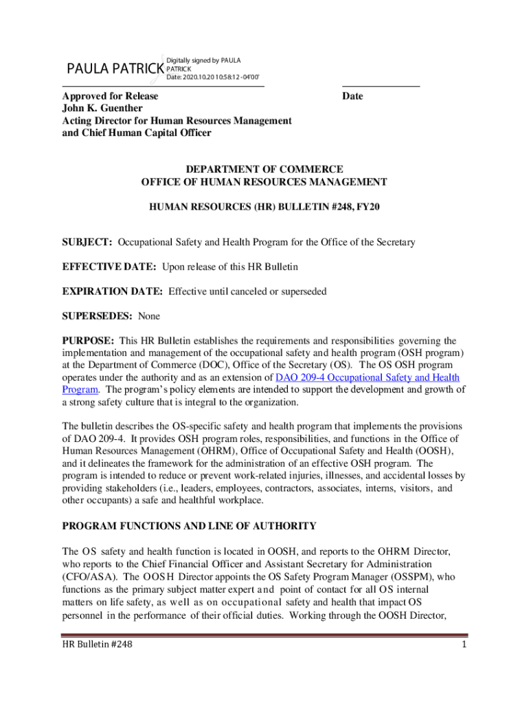 Digitally signed by PAULAPAULA PATRICK Date: 2020.10.20 10:58:12 04 '00 Approved for Release John K. Gunther Acting Director for Human Resources Management and Chief Human Capital Officer DateDEPARTMENT
