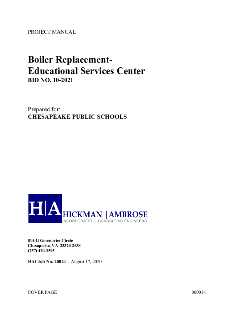 PROJECT MANUALBoiler ReplacementEducational Services Center BID NO. 102021Prepared for: CHESAPEAKE PUBLIC SCHOOLS814G Greenbrier Circle Chesapeake, VA 233202638 (757) 4203595HAI Job No. 20024 August