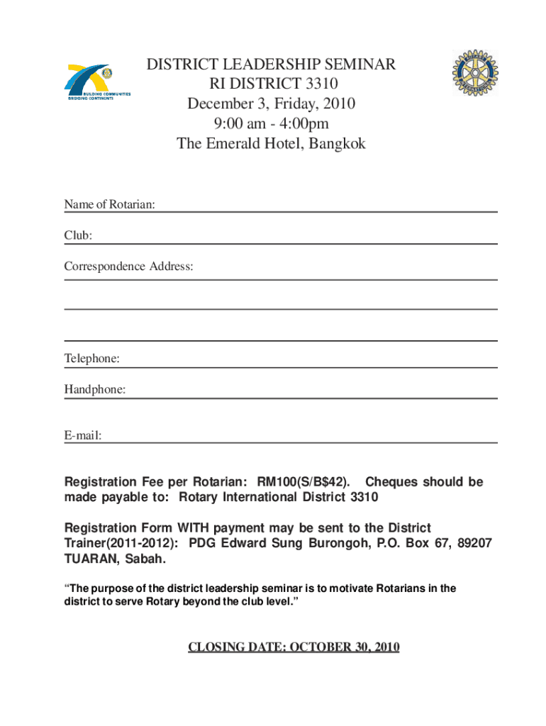 DISTRICT LEADERSHIP SEMINAR RI DISTRICT 3310 December 3, Friday, 2010 9:00 am 4:00pm The Emerald Hotel, BangkokName of Rotarian: Club: Correspondence Address:Telephone: Hand phone:Email:Registration