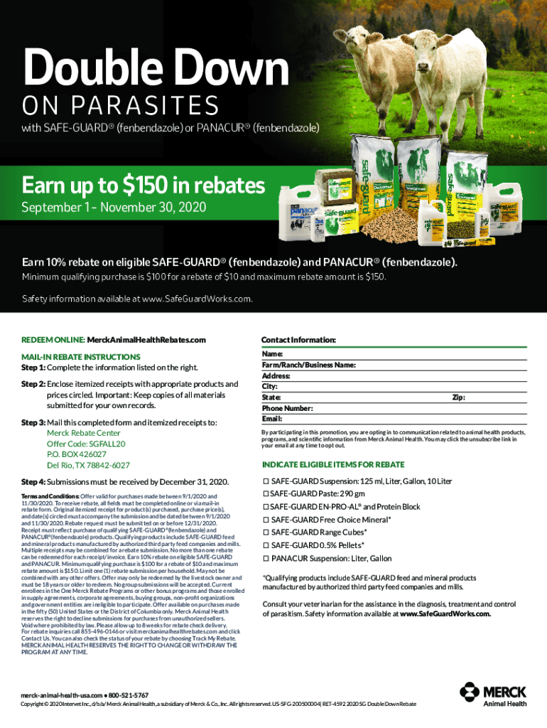 Double Down O N PA R A S I T ES with SAFEGUARD (fenbendazole) or PANACEA (fenbendazole)Earn up to $150 in rebates September 1 November 30, 2020Earn 10% rebate on eligible SAFEGUARD (fenbendazole)