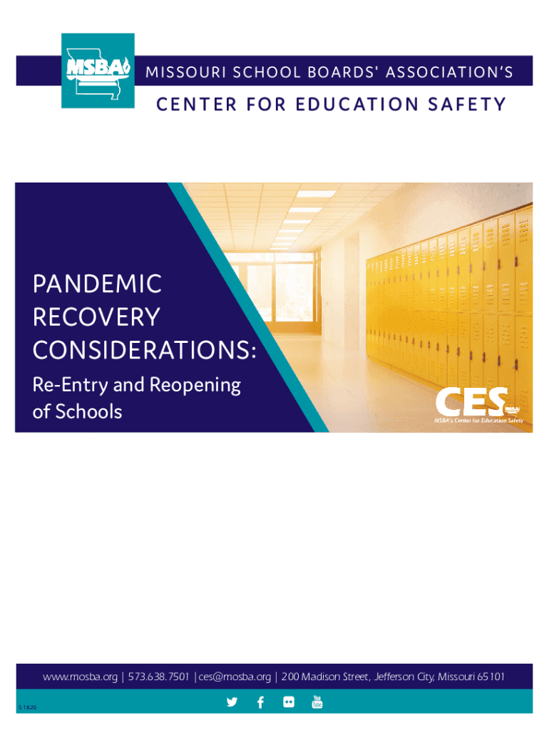 M I SS O U R I S C H O O L B OA R D S A S S O C I AT I O N SC E N T E R F O R E D U C AT I O N S A F E TY PANDEMIC RECOVERY CONSIDERATIONS: Reentry and Reopening of Schools.Mosley.org 573.638.7501
