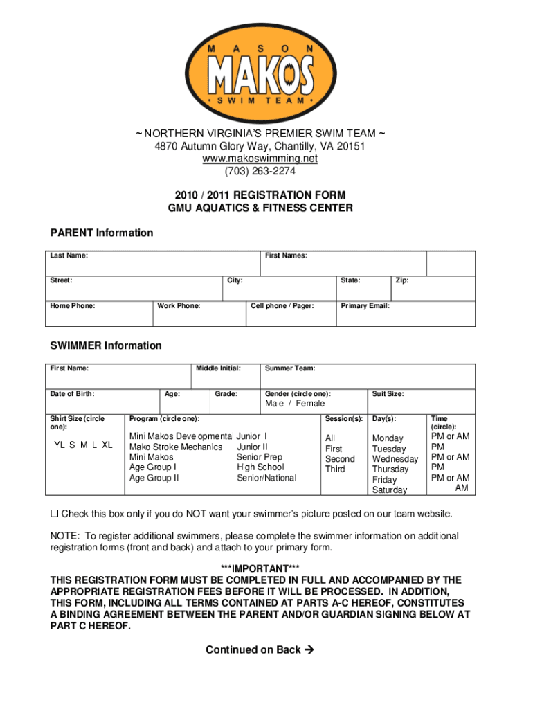 NORTHERN VIRGINIA PREMIER SWIM TEAM 4870 Autumn Glory Way, Chantilly, VA 20151 www.makoswimming.net (703) 2632274 2010 / 2011 REGISTRATION FORM GMU AQUATICS & FITNESS CENTER PARENT Information Last
