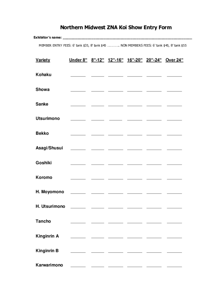 Northern Midwest RNA KOI Show Entry Form Exhibitors name: MEMBER ENTRY FEES: 6 tank $35, 8 tanks $45. NON MEMBERS FEES: 6 tank $45, 8 tanks $55VarietyUnder 8 812 1216 1620 2024 Over 24Kohaku Show