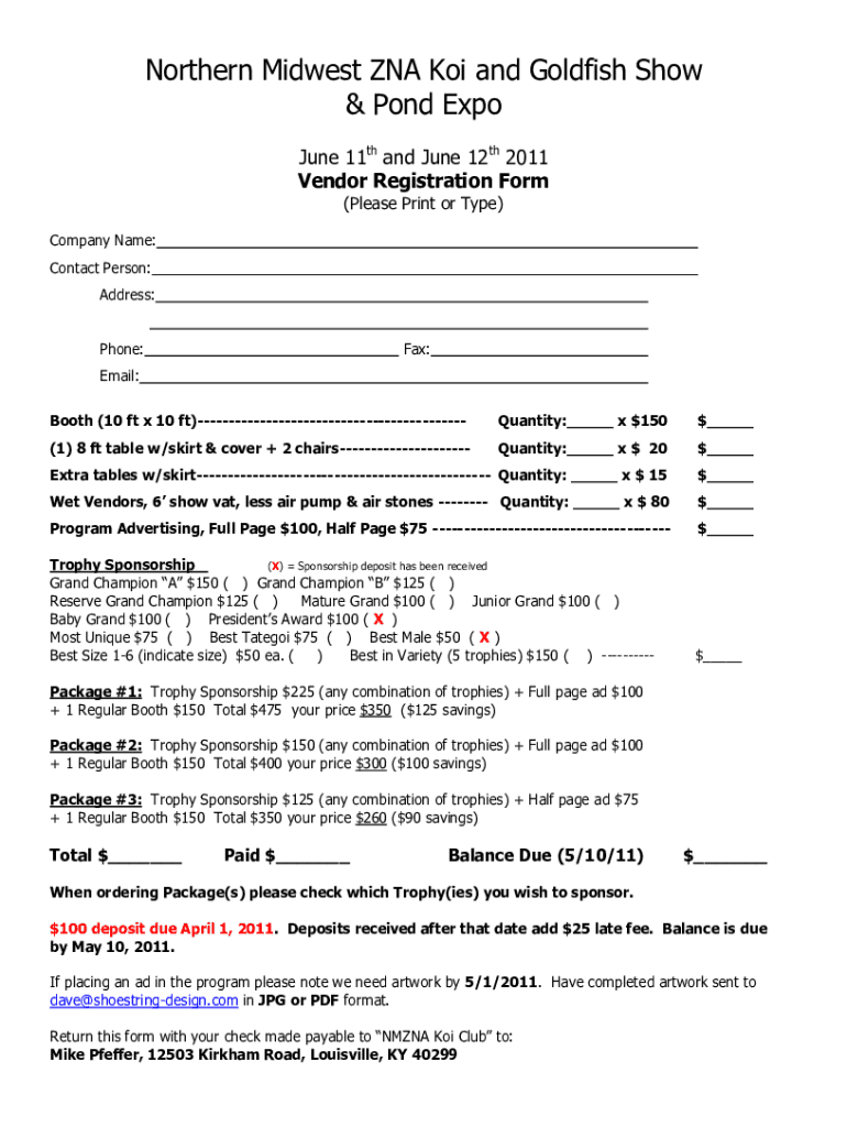 Northern Midwest RNA KOI and Goldfish Show & Pond Expo June 11th and June 12th 2011 Vendor Registration Form (Please Print or Type)Company Name: Contact Person: Address: Phone:Fax:Email: Booth (10