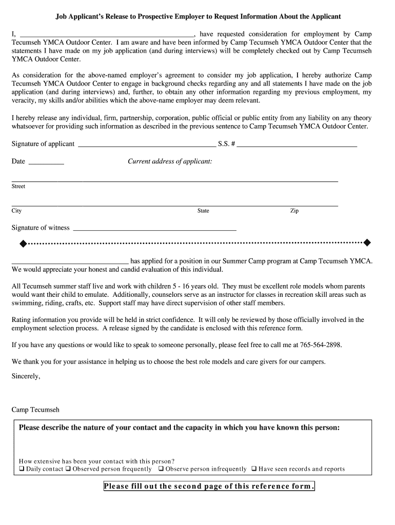 The Job Applicant’s Release to Prospective Employer is an employment document used by Camp Tecumseh YMCA to authorize background checks and evaluate job applicants.