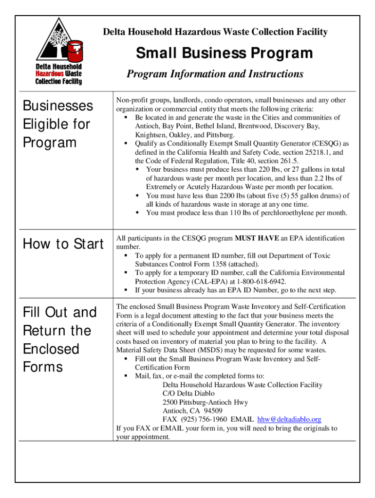 Delta Household Hazardous Waste Collection Facility Small Business Program Information and InstructionsBusinesses Eligible for ProgramNonprofit groups, landlords, condo operators, small businesses