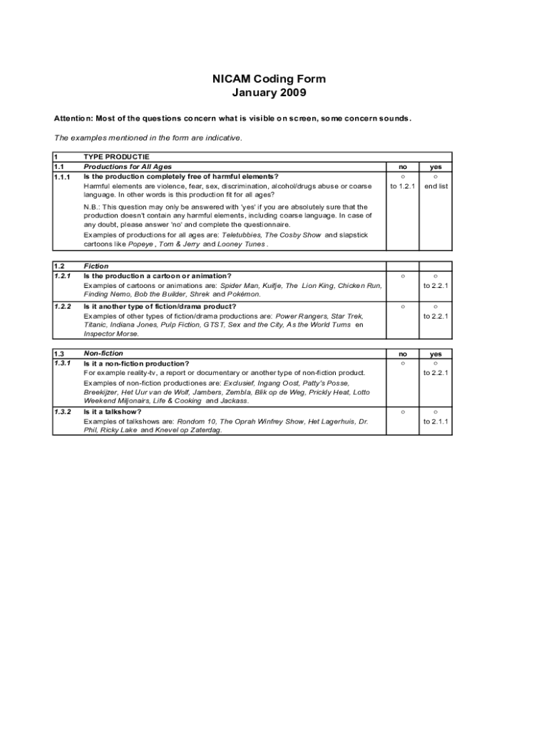 CICAM Coding Form January 2009 Attention: Most of the questions concern what is visible on screen, some concern sounds. The examples mentioned in the form are indicative. 1 1.1 1.1.1TYPE PRODUCTIVE