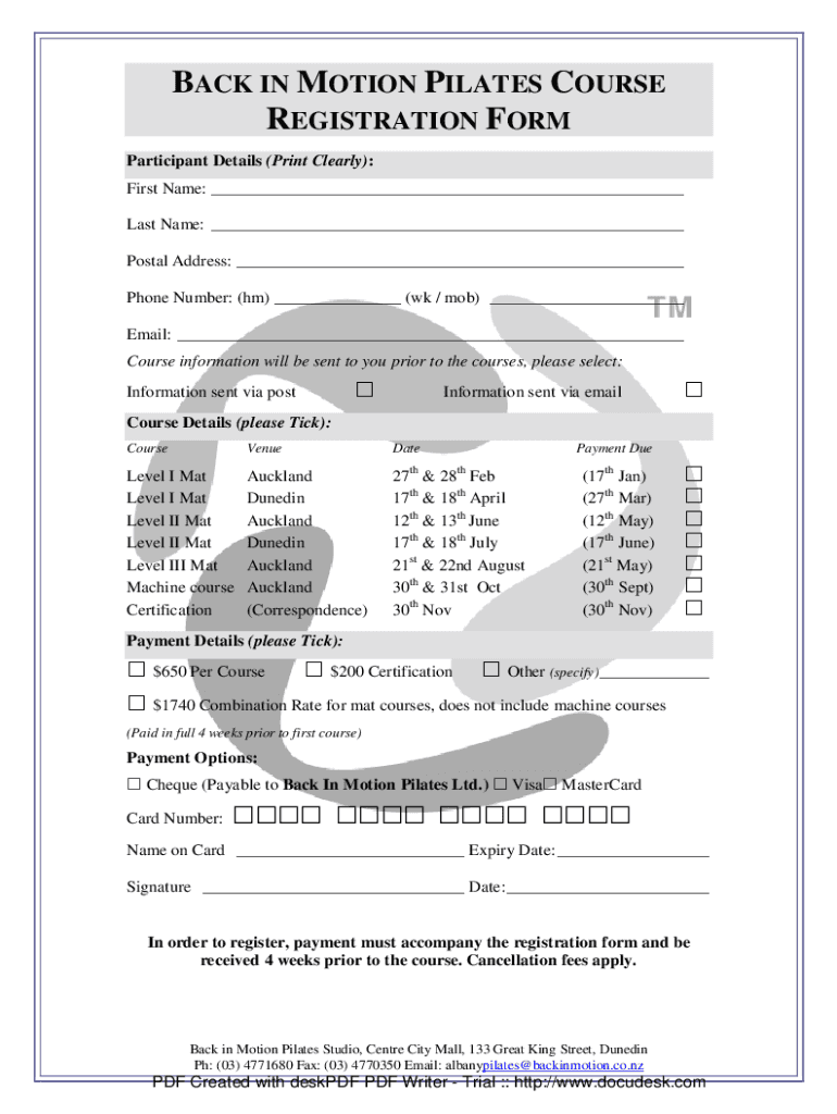 BACK IN MOTION PILATES COURSE REGISTRATION FORM Participant Details (Print Clearly): First Name: Last Name: Postal Address: Phone Number: (hm) (wk / mob) Email: Course information will be sent to