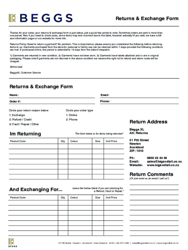 Returns & Exchange Form Thanks for your order, your returns & exchange form is just below, just a quick few points to note: Sometimes orders are sent in more than one parcel. Also, if you need to