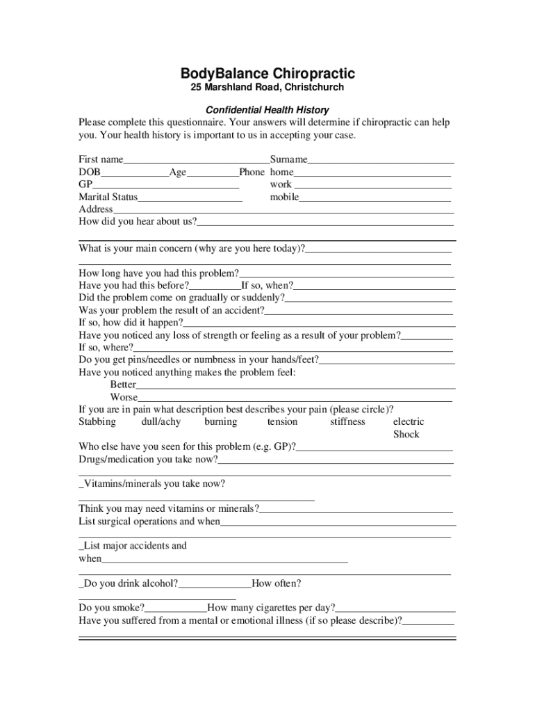 Outbalance Chiropractic 25 Marshland Road, Christchurch Confidential Health HistoryPlease complete this questionnaire. Your answers will determine if chiropractic can help you. Your health history