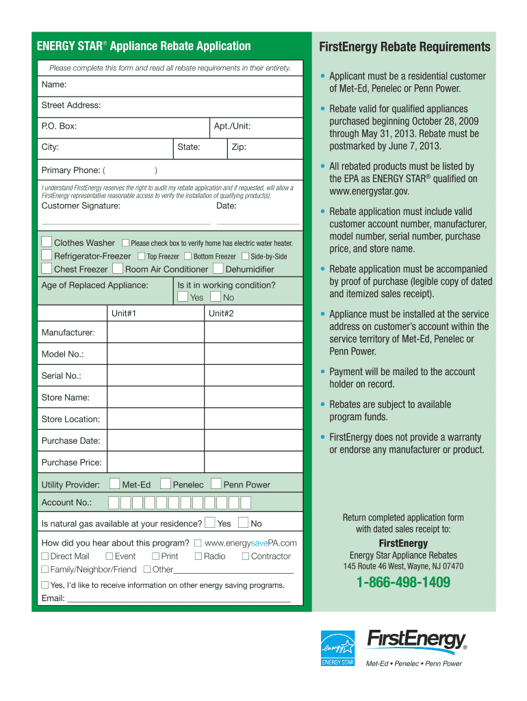 To be eligible for the rebate, applicants must be residential customers of Met-Ed, Penelec, or Penn Power, and have purchased qualified ENERGY STAR appliances between October 28, 2009, and May 31, 2013.