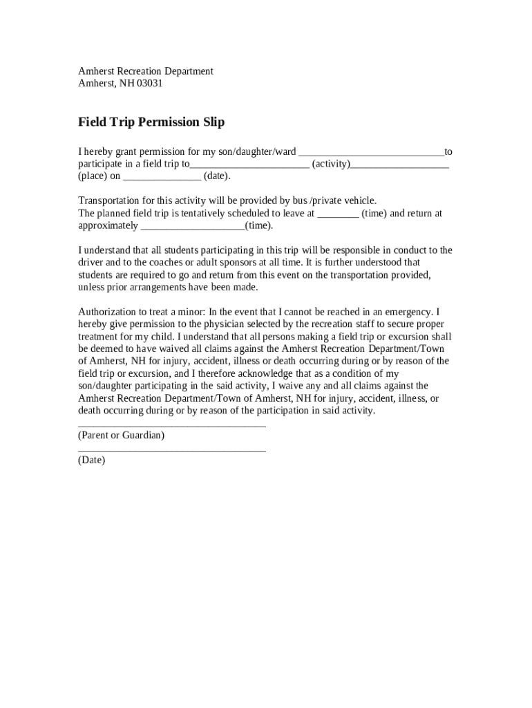 The I hereby grant permission for my son/daughter/ward to participate in a field trip to (activity) (place) on (date) is a fillable form in MS Word extension that should be submitted to the required address to provide specific info. It must be filled-out and signed, which may be done manually, or with the help of a particular software such as PDFfiller. This tool allows to complete any PDF or Word document directly from your browser (no software requred), customize it depending on your needs and put a legally-binding electronic signature. Right away after completion, user can easily send the I hereby grant permission for my son/daughter/ward to participate in a field trip to (activity) (place) on (date) to the appropriate recipient, or multiple ones via email or fax. The editable template is printable too because of PDFfiller feature and options presented for printing out adjustment. Both in electronic and in hard copy, your form will have got organized and professional look. Also you can turn it into a template for further use, there's no need to create a new blank form over and over. All you need to do is to customize the ready template.