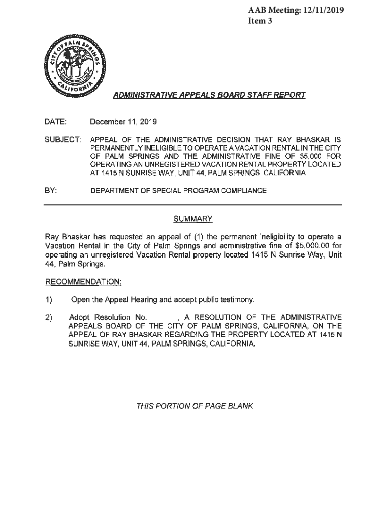 Item 3ADMINISTRATIVE APPEALS BOARD STAFF REPORTAGE:December 11, 2019SUBJECT:APPEAL OF THE ADMINISTRATIVE DECISION THAT RAY BHASKAR IS