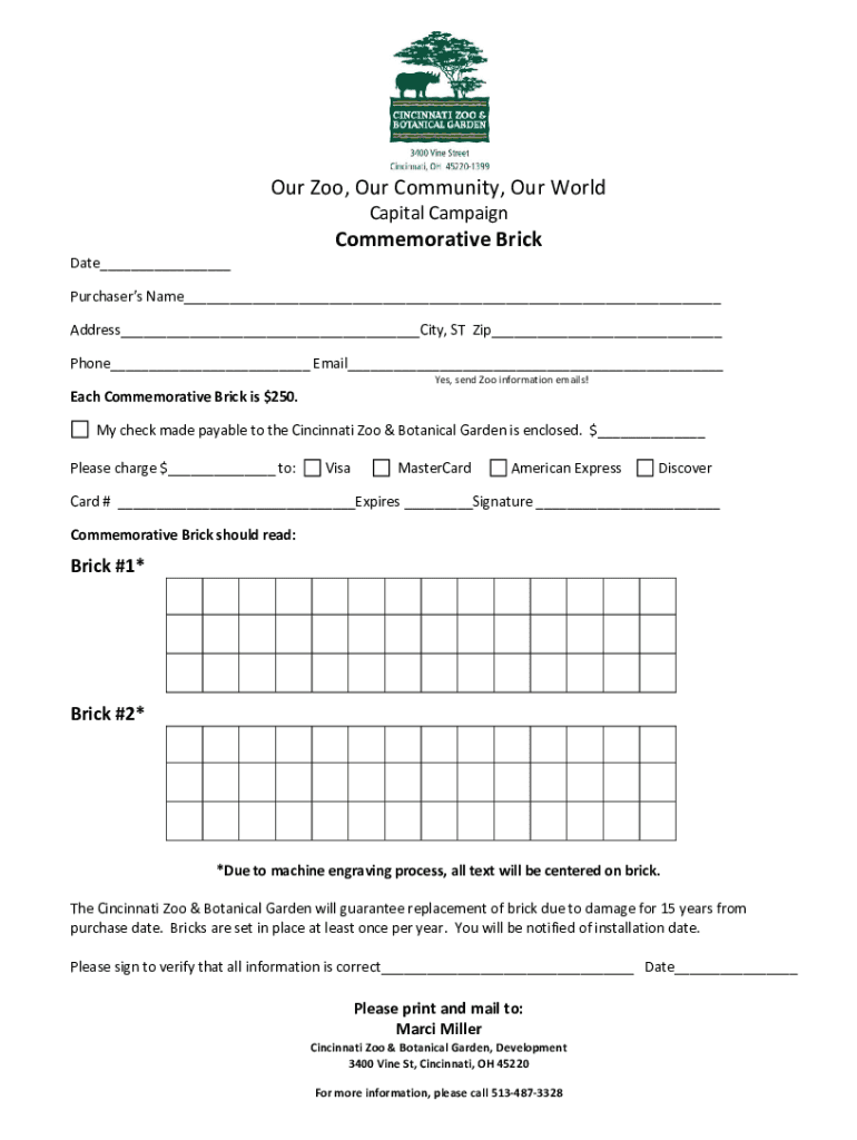 Ouzo, Community, World CapitalCampaignCommemorativeBrick Date PurchasersName Address City, Strip Phone Email Yes, sendZooinformationemails! EachCommemorativeBrickis$250. MycheckmadepayabletotheCincinnatiZoo&BotanicalGardenisenclosed