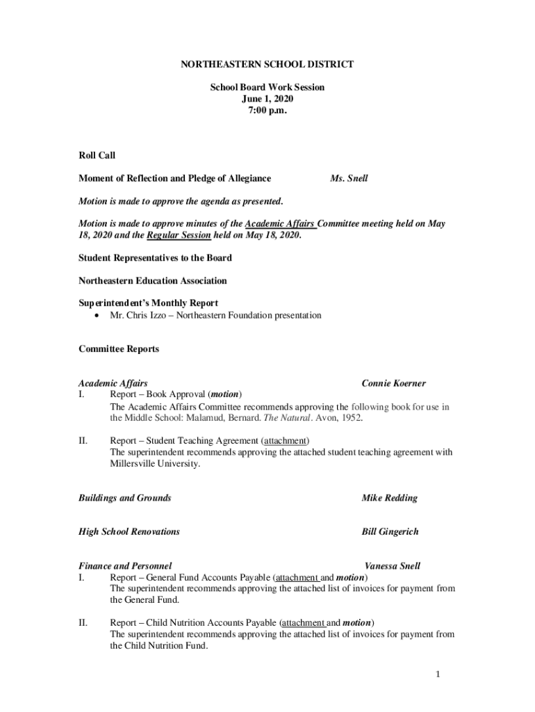 NORTHEASTERN SCHOOL DISTRICT School Board Work Session June 1, 2020 7:00 p.m. Roll Call Moment of Reflection and Pledge of Allegiances. SnellMotion is made to approve the agenda as presented. Motion