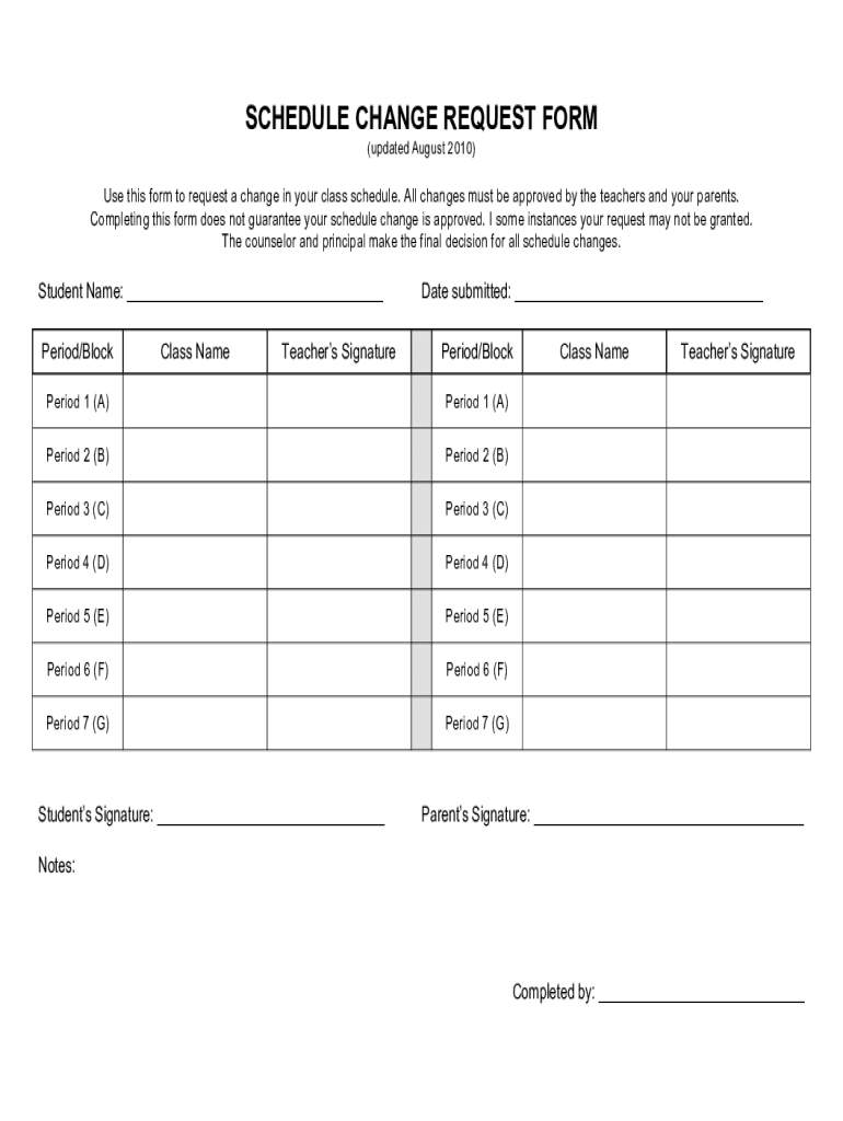 SCHEDULE CHANGE REQUEST FORM (updated August 2010)Use this form to request a change in your class schedule. All changes must be approved by the teachers and your parents. Completing this form does