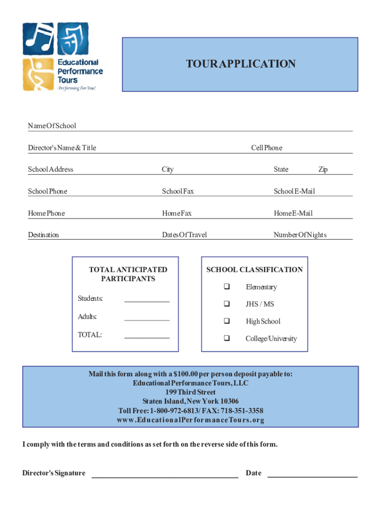 TOUR APPLICATIONName Of School Director's Name & TitleCell Homeschool AddressCityStateSchool Homeschool School Mailbomb Phoneme Fathom EMailDestinationDates Of TravelNumber Of Nightspot ANTICIPATED